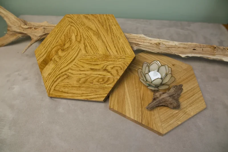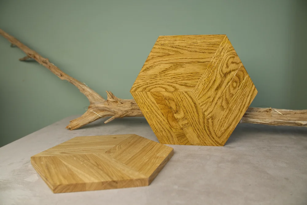 De zeshoek is een van de meest perfecte vormen in de natuur — je vindt hem in honingraten, in (sneeuw)kristallen, in de structuur van basaltsteen. De Hexagonum brengt die vorm naar jouw interieur, gevat in massief Europees eikenhout met zijn warme nerf en tijdloze karakter.