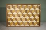 Dit exemplaar is vervaardigd uit duurzaam Europees vurenhout, met de hand gebeitst in drie zorgvuldig afgestemde tinten. Elke ruit is individueel gezaagd, geschuurd, gebeitst en geplaatst. Het resultaat is een stuk wandkunst dat rust en beweging tegelijk uitstraalt. Het is 64 cm breed bij 42 cm hoog.