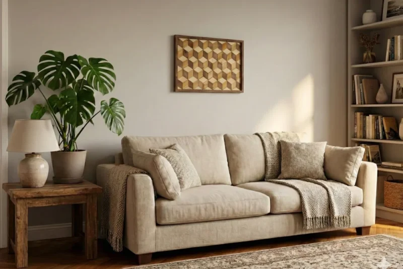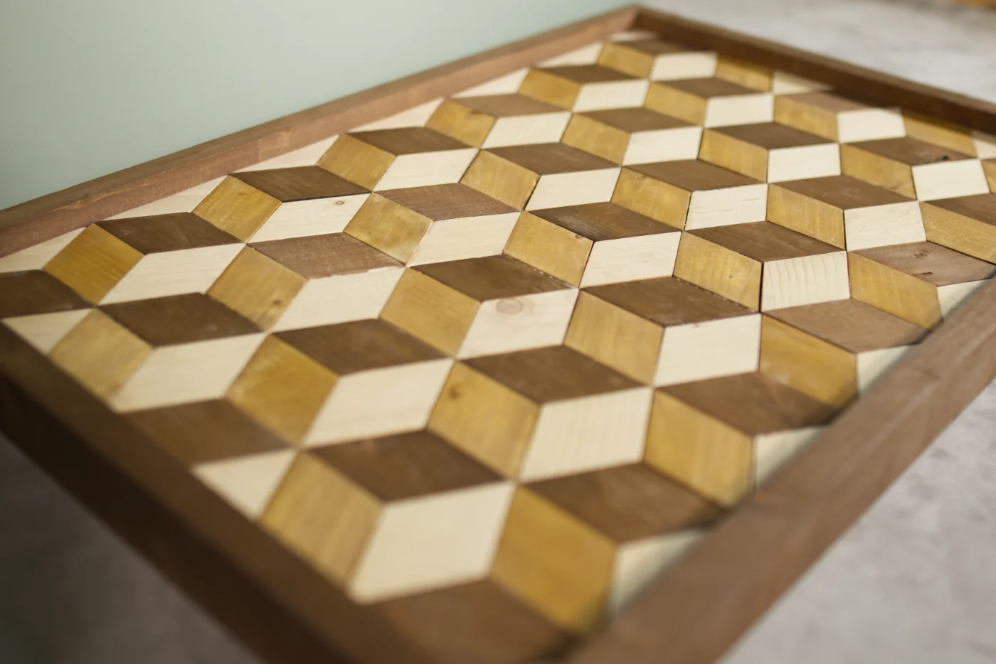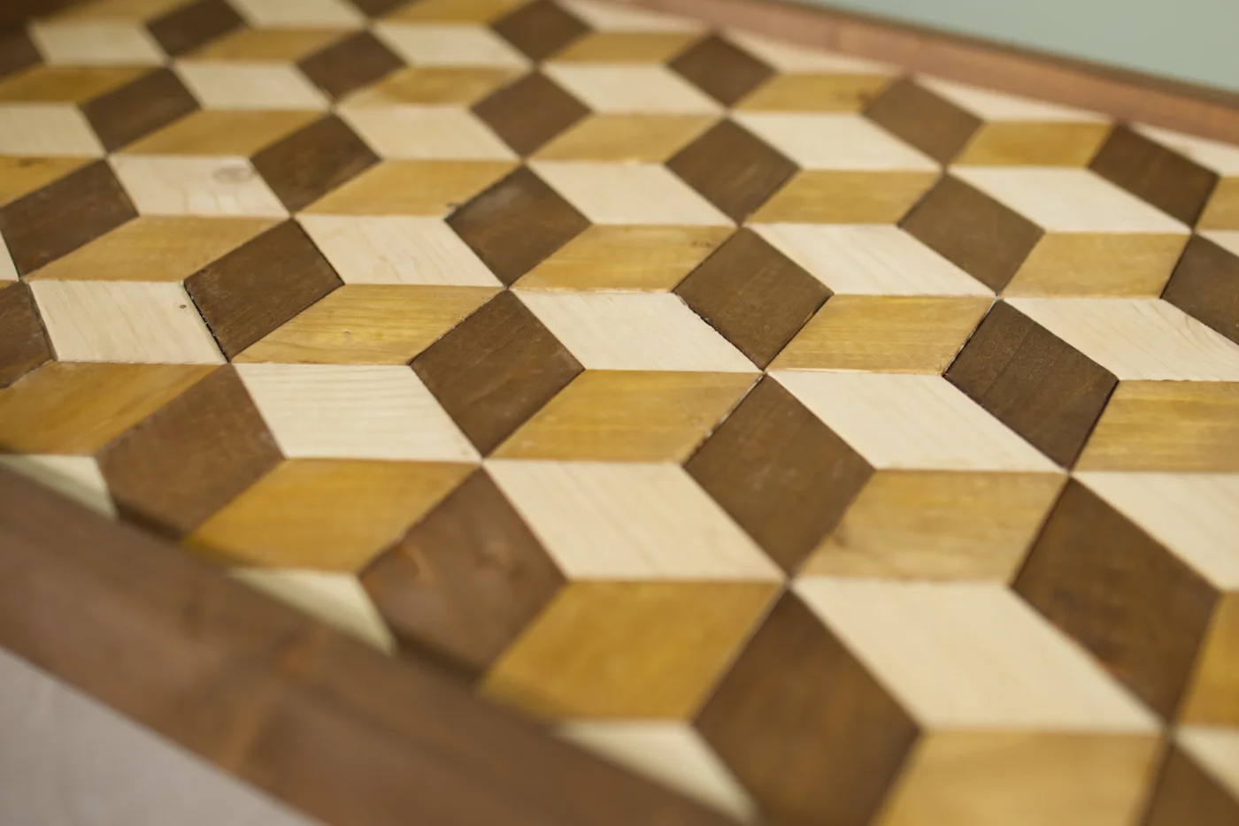 Het geheim zit in de eenvoud: ruitvormige elementen, geplaatst in drie richtingen, elk met een eigen tint. Je oog doet de rest. Waar je ook kijkt, je ziet kubussen — stapelend, kantelend, tuimelend. Vandaar de naam.